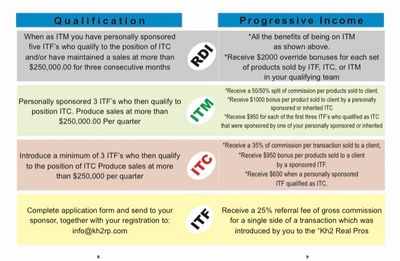 Benefits: As an ITC you are entitled to sell Kh2 Real Pros specified products under its licenses and earn a commission of 40% per each closed transaction. You are also entitled to earn an 8% commission from each closed transaction introduced by your personally sponsored ITF. Each time one of your personally sponsored ITF qualifies to an ITC you will earn another bonus of $950.00 for products sold to a client/customer by your sponsored ITF